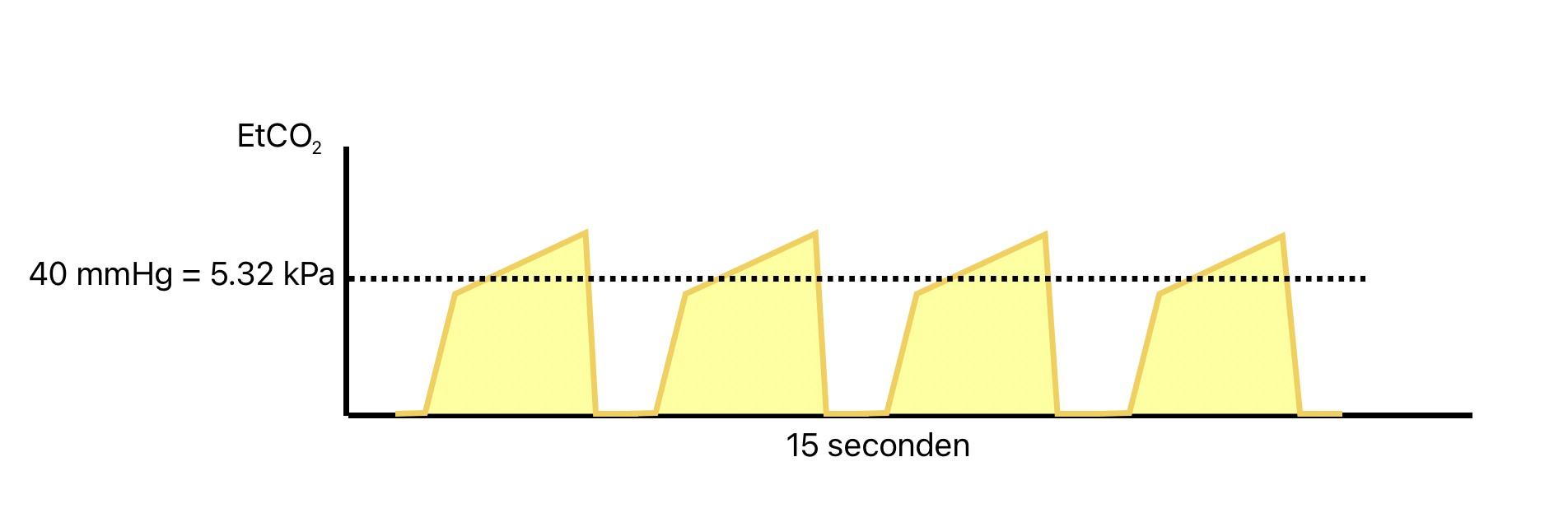 Bij een correcte tracheale intubatie wordt de tube in de luchtpijp geplaatst. Dit resulteert in een duidelijk capnogram met een herkenbaar, consistent patroon van CO2-concentraties gedurende de ademhalingscyclus.