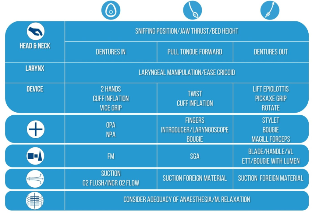 - Check of de patiënt in de correcte positie ligt (sniffing position; behalve wanneer er verdenking CWK-letsel is)