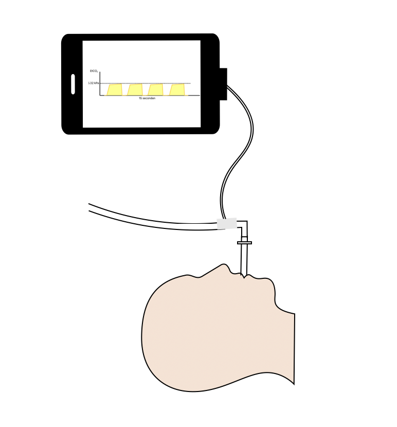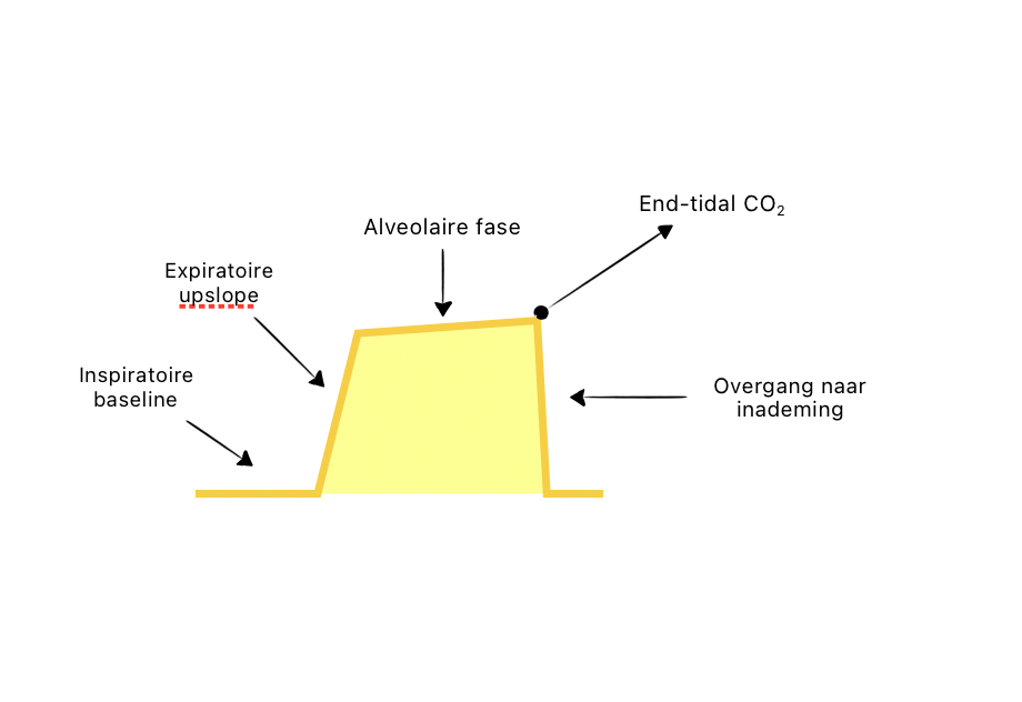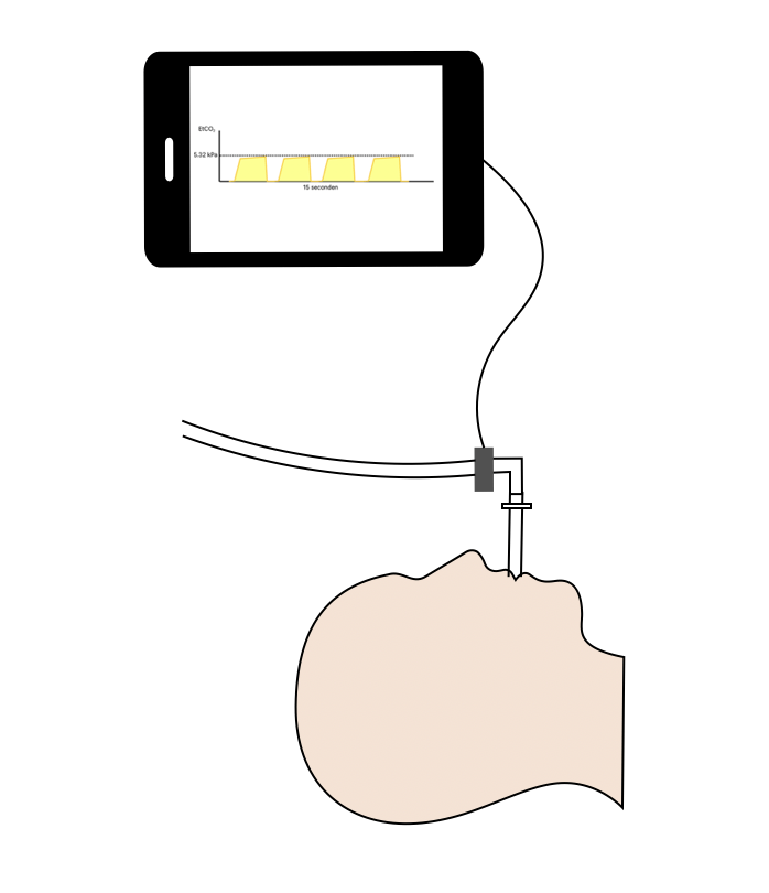 Capnografie is een niet-invasieve monitoringtechniek die het kooldioxidegehalte (CO2) in de uitgeademde lucht van een patiënt meet. Het biedt een grafische en numerieke weergave van de CO2-concentratie gedurende de ademhalingscyclus, bekend als een capnogram. Een normaal capnogram ziet eruit als volgt: een snelle stijging, vervolgens een plateau fase, en weer een snelle daling, met een korte fase waarbij de curve een aantal seconden op de nul blijft. Dit is het moment van inademing. De End-Tidal CO2 (EtCO2) is de hoeveelheid CO2 dat wordt gemeten aan het einde van de uitademing.